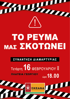Ο ΣΚΕΑΝΑ και τα μέλη του σας καλούν στην κινητοποίηση- διαμαρτυρία με θέμα “ΤΟ ΡΕΥΜΑ μας ΣΚΟΤΩΝΕΙ” την Τετάρτη, 16/2/2022 και ώρα 18:00 στην Πλατεία Γεωργίου. Θα ακολουθήσει πορεία διαμαρτυρίας, στην οποία συμβολικά οι...